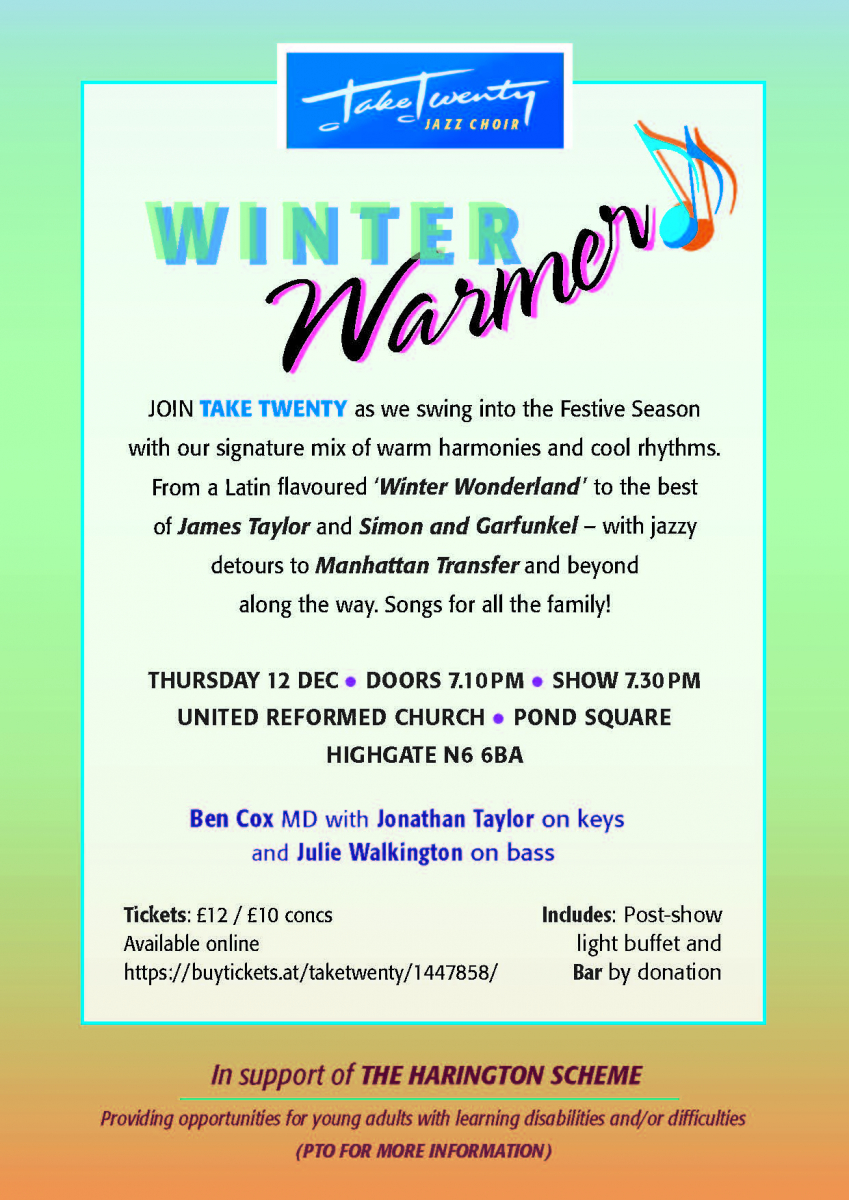JOIN TAKE TWENTY as we swing into the Festive Season with our signature mix of warm harmonies and cool rhythms. From a Latin flavoured ‘Winter Wonderland ’ to the best of James Taylor and Simon and Garfunkel – with jazzy detours to Manhattan Transfer and beyond along the way. Songs for all the family!